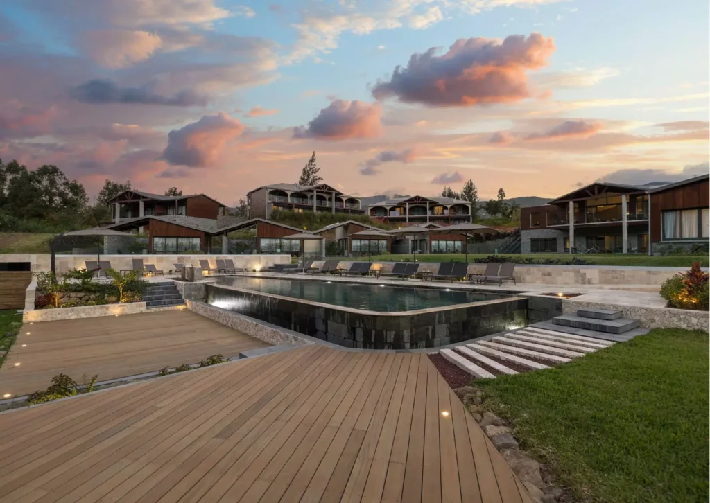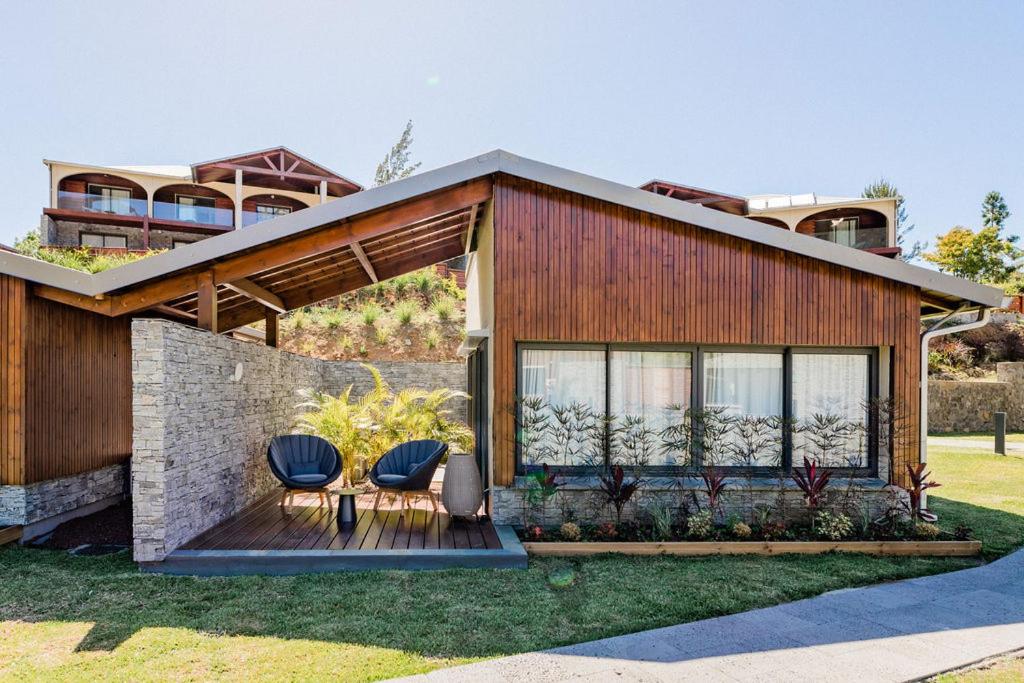 Situé à environ 950 mètres d’altitude, à 1h15 de Saint-Denis, l’établissement se distingue par son architecture élégante — mélange de bois, pierre volcanique et lignes contemporaines — et par son ambiance chaleureuse inspirée des Hauts de l’île.